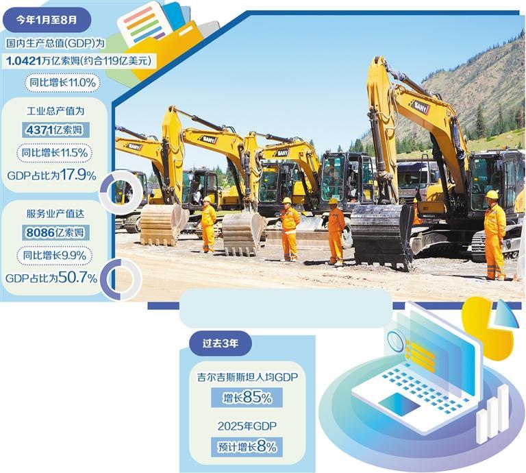 吉尔吉斯斯坦国家统计委员会日前公布的数据显示,今年前8个月,吉尔吉斯斯坦国内生产总值(GDP)为1.0421万亿索姆(约合119亿美元),同比增长11.0%,显著高于去年同期的8.3%,在中亚地区独占鳌头。吉尔吉斯斯坦今年的经济高增长主要依靠工业、建筑和服务业多点发力。其中,工业和建筑业贡献突出,成为拉动经济上扬的重要引擎,商品生产部门增速高达13.7%,而服务业和净产品税分别增长9.5%和10.8%。