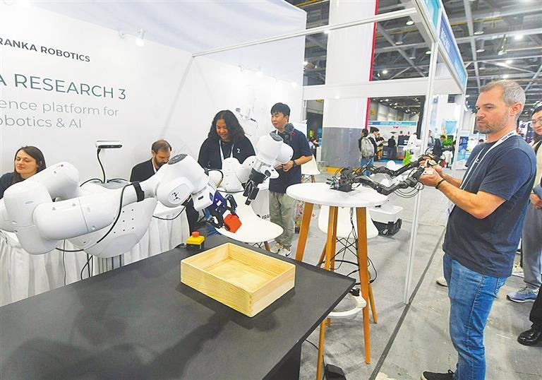 10月21日,2025国际智能机器人与系统大会(IROS 2025)在杭州开幕,国外参展商在大会上演示训练机器人拿取物品。本届大会吸引7000余名国际顶尖专家、学者及企业代表,为全球机器人产业创新发展注入动力。龙 巍摄(中经视觉)