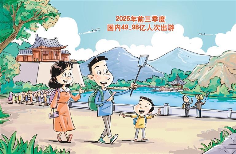根据国内居民出游抽样调查统计结果,前三季度,国内居民出游人次49.98亿,比上年同期增加7.61亿人次,同比增长18.0%。其中,城镇居民国内出游人次37.89亿,同比增长15.9%;农村居民国内出游人次12.09亿,同比增长25.0%。旅游市场的强劲表现不仅带动了交通、餐饮、住宿等相关产业发展,更成为推动内需增长的重要引擎。下一步,应持续推进文旅深度融合,培育消费新增长点。相关部门需加强市场监管与资金支持,完善乡村旅游基础设施,释放农村消费潜力;企业应积极应用数字技术开发智慧旅游产品,打造文旅融合新业态。此外,各地应因地制宜,挖掘特色文化资源,打造差异化文旅项目,以优质供给提升游客体验,形成持续吸引力。(时 锋)