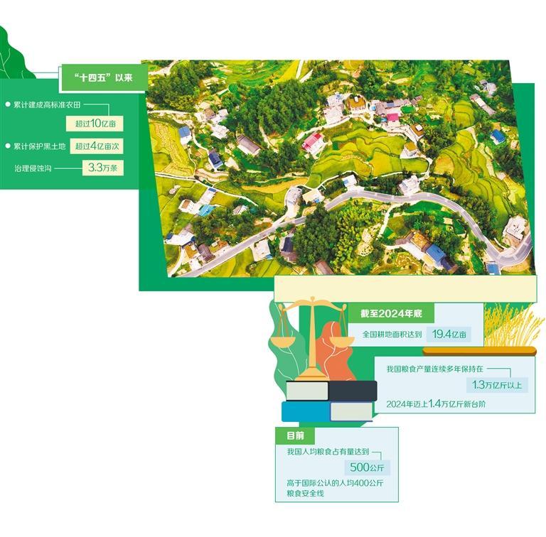 耕地是粮食生产的命根子。我国严守18亿亩耕地红线,对各类破坏耕地的行为零容忍。数据显示,截至2024年底,全国耕地面积达到19.4亿亩,比2020年增加了2800万亩。