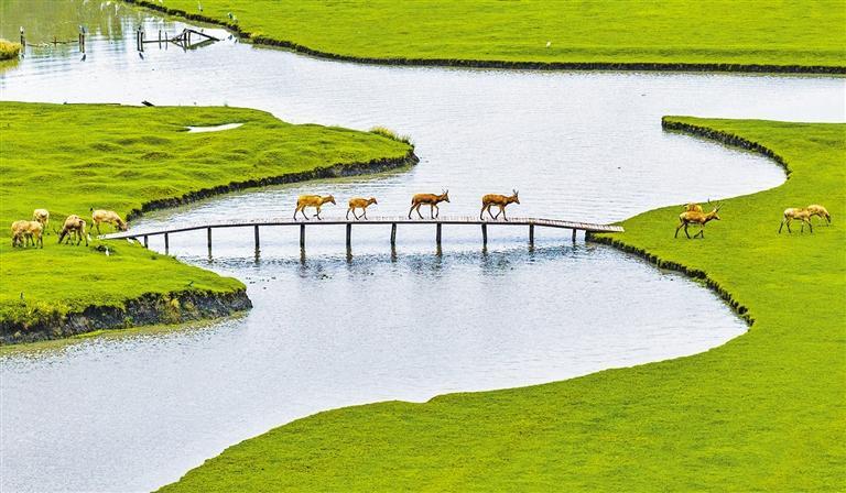 10月17日,江苏省泰州市姜堰区溱湖国家湿地公园内,麋鹿漫步,生态和谐,景美如画。