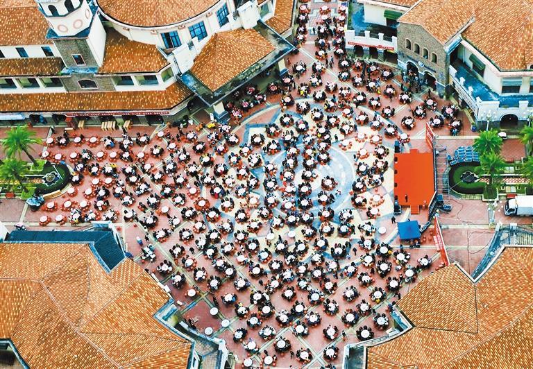 10月26日,贵州省安顺市新安街道家喻社区举办“情暖中秋 爱在重阳”长桌宴活动,3000余位居民齐聚一堂。 卢 维摄(中经视觉)