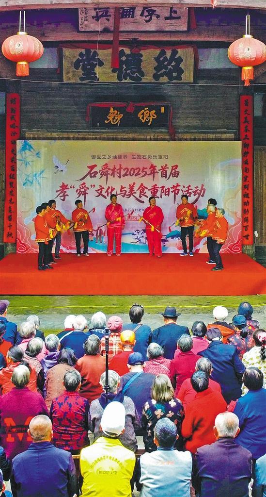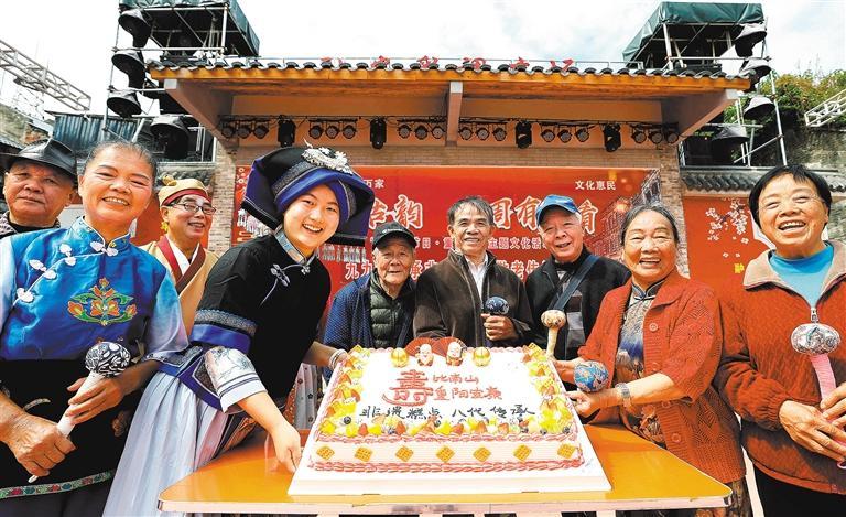 10月25日,广西柳州市融安县彩调广场,人们在“九九重阳承非遗 匠心敬老传温情”主题文化活动分享非遗糕点。覃庆和摄(中经视觉)