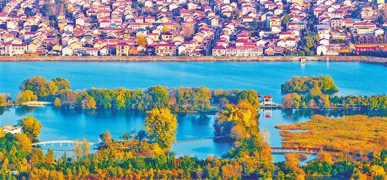11月2日,深秋的安徽省淮北市烈山区烈山镇榴园村层林尽染,金黄的石榴园与远处的村庄相映成景。