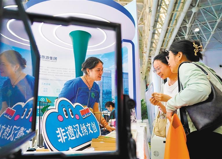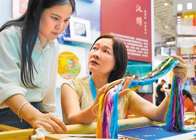 如今,汉绣与现代生活越来越近,蕴含汉绣元素的卷轴挂画、汉绣摆件、扇子、包包、书签、茶旗、杯垫、镜子、耳钉等特色绣品,深受广大年轻人的喜爱与追捧。汉绣还现身外交部湖北全球推介活动,走向世界。