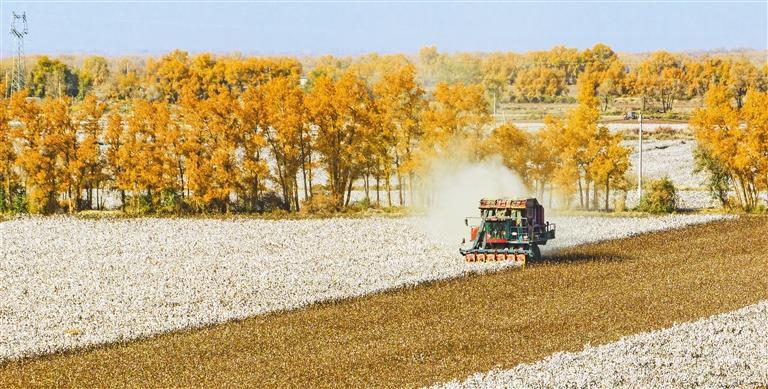 11月4日,新疆巴音郭楞蒙古自治州尉犁县兴平镇孔雀村,采棉机在棉田里来回穿梭采收棉花。近年来,当地运用农业新技术,延长棉花的生长周期,棉花产量和品质得到有效提升。