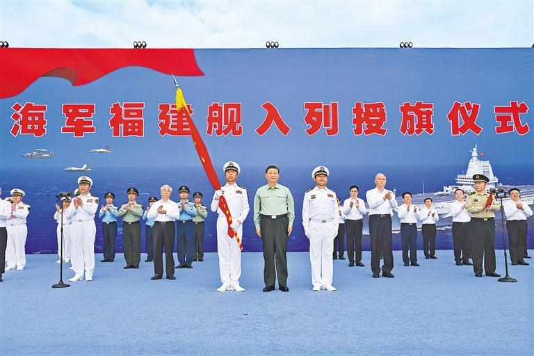 新华社三亚11月7日电(记者梅常伟)我国第一艘电磁弹射型航空母舰福建舰入列授旗仪式5日在海南三亚某军港举行。中共中央总书记、国家主席、中央军委主席习近平出席入列授旗仪式并登舰视察。