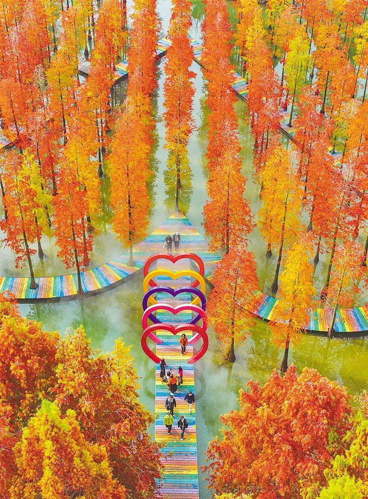 十一月九日,江苏泗洪洪泽湖湿地景区临淮段水杉林迎来最佳观赏期,吸引众多游客前来赏景,感受初冬湿地之美。张连华摄(中经视觉)
