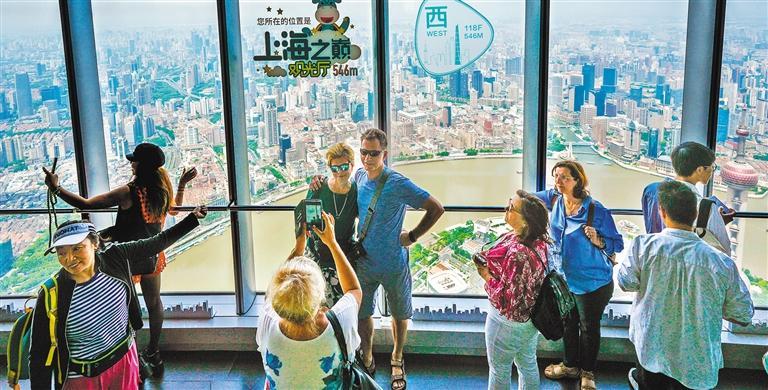 9月15日,中外游客在上海中心大厦118层上海之巅观光厅拍照“打卡”。作为浦东著名地标建筑,这里已成为游客欣赏上海全景的“网红打卡点”。陈梦泽摄(中经视觉)