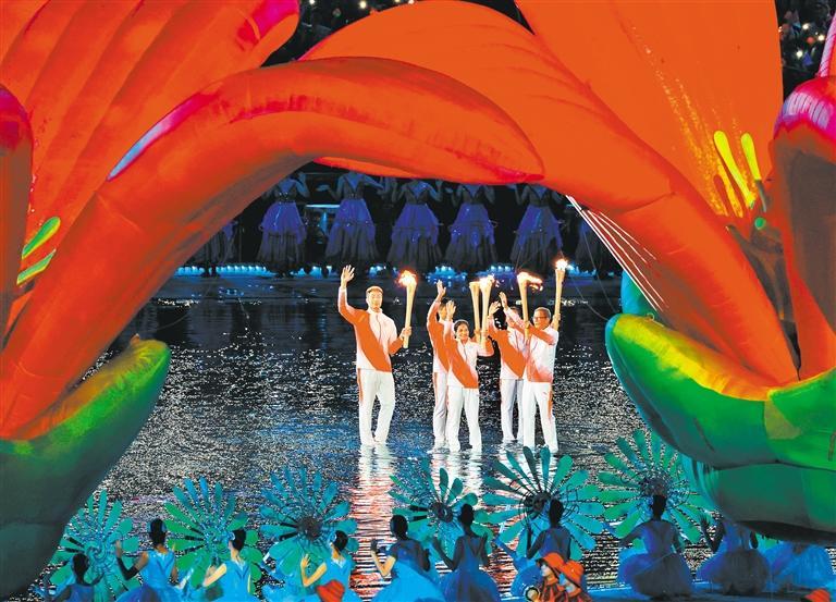 11月9日晚,十五运会开幕式上,优秀运动员代表手持采自南海1522米深处的圣火,站在水舞台中央,向观众挥手致意。
