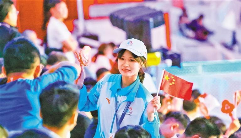 11月9日,志愿者在十五运会开幕式看台与观众互动。本次开幕式场馆及周边赛会志愿者共有2350人,来自广州地区16所高校28个校区。