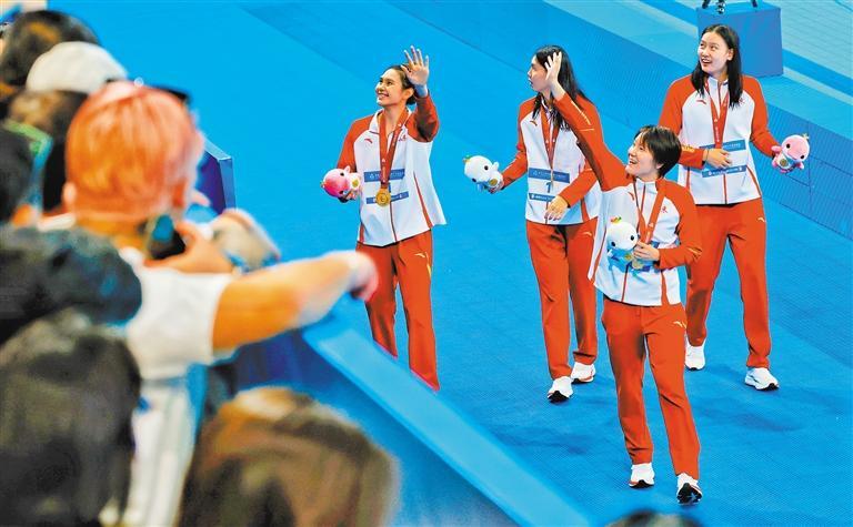 11月10日,十五运会女子4×100米自由泳接力决赛颁奖仪式后,夺冠的山东队向现场观众致意。
