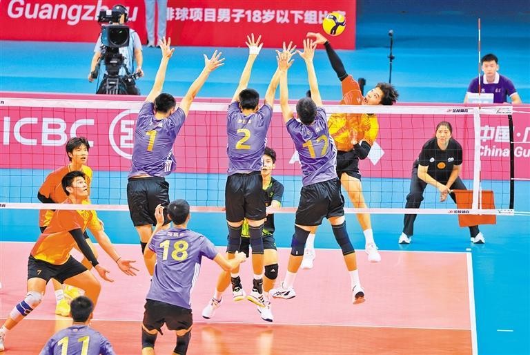 11月10日,运动员在十五运会U18男排小组赛中比拼。
