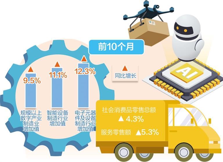 新兴产业发展壮大,引领支撑作用日益增强。数字经济快速发展,绿色低碳转型持续深入,人工智能赋能产业发展,数字制造、智能制造等行业成长壮大。前10个月,规模以上数字产业制造业增加值同比增长9.5%,智能设备制造、电子元器件及设备制造行业增加值分别增长11.1%和12.3%。新能源、新材料、航空航天、低空经济等发展潜力巨大,量子科技、生物制造、具身智能等前景广阔,未来有望成为新兴支柱产业,有力支撑新动能发展壮大。