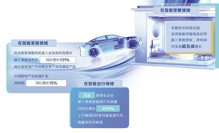 科技赋能,解锁消费新可能。在智能家居领域,科沃斯家用服务机器人业务保持高增长,前三季度净利润同比增长131%;海尔智家用户共创推出多个冰洗爆款产品,空调厨电产业快速扩张,净利润同比增长15%。在智能穿戴领域,华勤技术持续巩固全球智能终端制造优势,前三季度营收、净利润均实现超五成增长。在智能出行领域,5家乘用车企业第三季度新能源汽车销量均环比增长超10%,上汽集团9月单月新能源汽车销量创历史新高;九号公司凭借高性能智能短交通产品构建差异化壁垒,电动摩托车销量占比提升带动前三季度净利润同比增长84%。