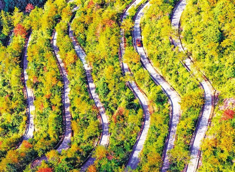 11月17日,浙江省台州市仙居县横溪镇盘山公路在色彩斑斓的山间蜿蜒。近年来,当地不断优化城乡交通路网布局,将一条条路修到农户家门口,方便群众出行的同时,有效助力乡村共富。王华斌摄(中经视觉)