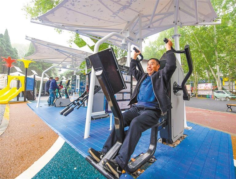 10月12日,河南省洛阳市牡丹公园,市民在“室外智能健身房”锻炼。智能健身系统可在线提供标准动作示范,保证运动安全。张怡熙摄(中经视觉)
