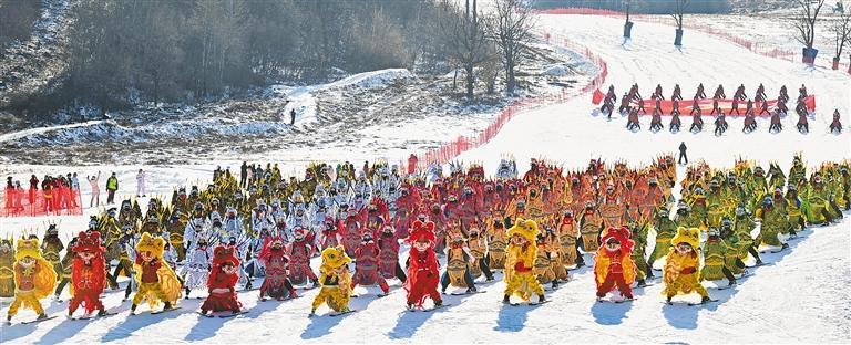 11月22日,吉林省2025—2026新雪季开板暨第31届吉林雾凇冰雪节开幕式在吉林市松花湖度假区举行。图为在开板仪式现场,表演者身着戏曲或舞狮服饰进行滑雪表演。