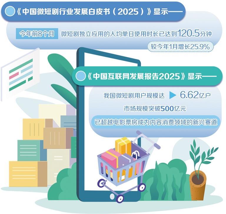 短剧市场用户的高黏性和高增长,给电商平台带来新机遇。《中国微短剧行业发展白皮书(2025)》显示,今年前8个月,微短剧独立应用的人均单日使用时长已达120.5分钟,较今年1月增长25.9%。此外,《中国互联网发展报告2025》显示,我国微短剧用户规模达6.62亿户,市场规模突破500亿元,已超越电影票房成为内容消费领域的新兴赛道。