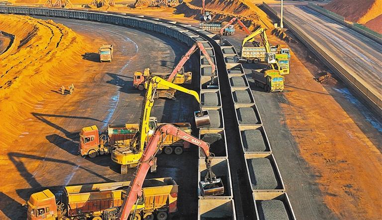 11月14日,山东港口烟台港龙口港区,装载机将煤炭装载到列车车厢。