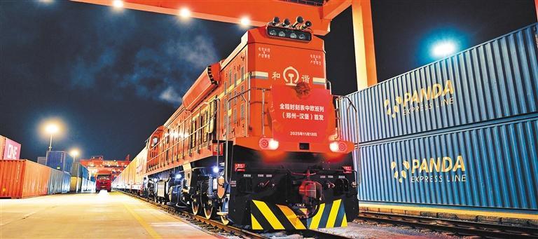 11月18日,河南省郑州市,一列满载货物的中欧班列从中国铁路郑州局集团有限公司圃田站启程,驶往德国汉堡。这是全国首列直达德国汉堡的全程时刻表中欧班列。
