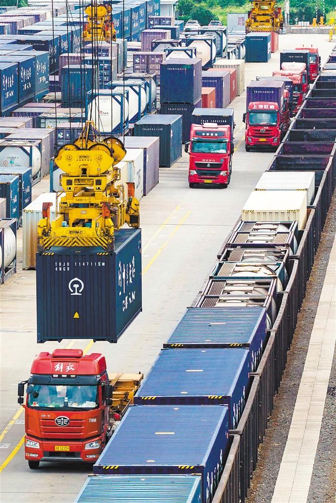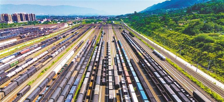7月16日,位于重庆市沙坪坝区的铁路兴隆场编组站,货运列车整装待发。今年1月至10月,全国经西部陆海新通道进出口额达1.35万亿元,同比增长17.9%。