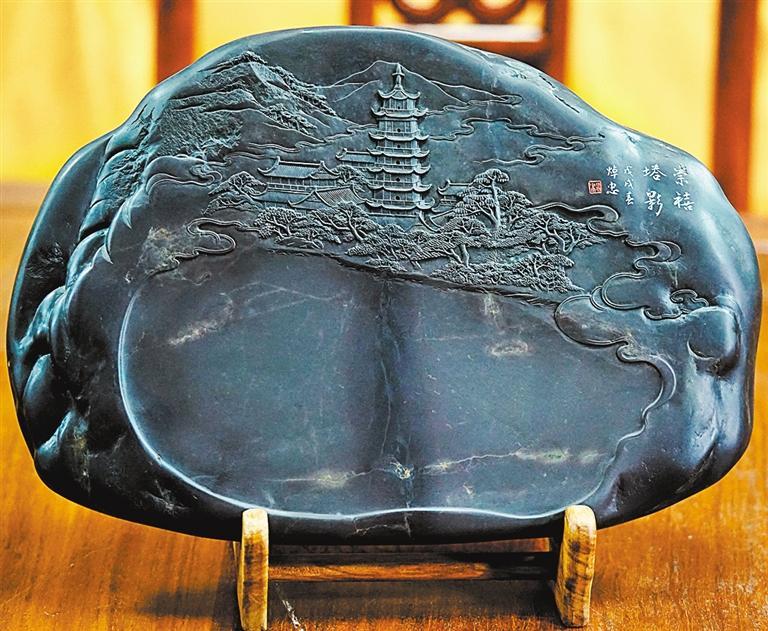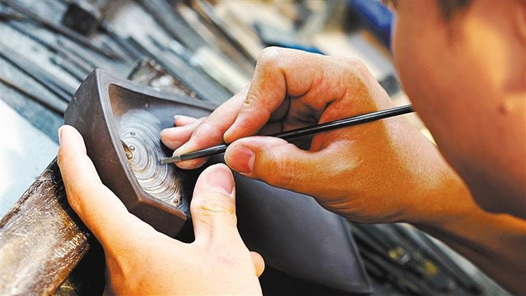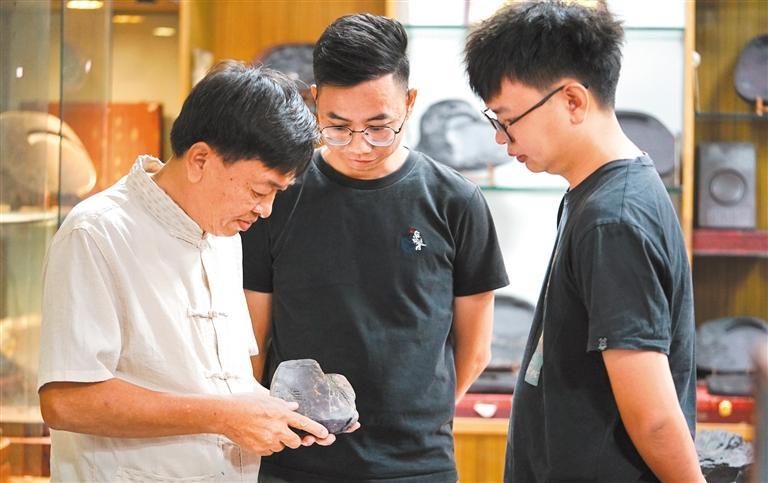 走进位于肇庆的端砚博物馆,古雅醇厚的文墨气息扑面而来。展柜中的端砚浑厚古朴,散发出被时光浸润过的华彩。在肇庆端州区端砚产业园区,随处可见手艺人在店铺门口或屋内角落里,于一盏灯下专注刻砚。刻刀与石面传出轻微绵密的沙沙声,仿佛匠人与自然在对话。
