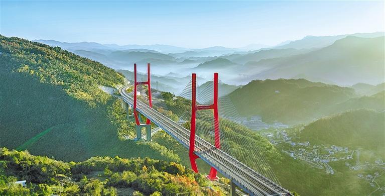11月28日,湖北宜来高速五峰县柴埠溪特大桥,以一袭“红妆”亮相武陵山区柴埠溪大峡谷。该桥是湖北首座高速公路与省道同层共建的斜拉桥,也是世界最宽双边工字钢组合梁斜拉桥,预计明年7月全线通车。