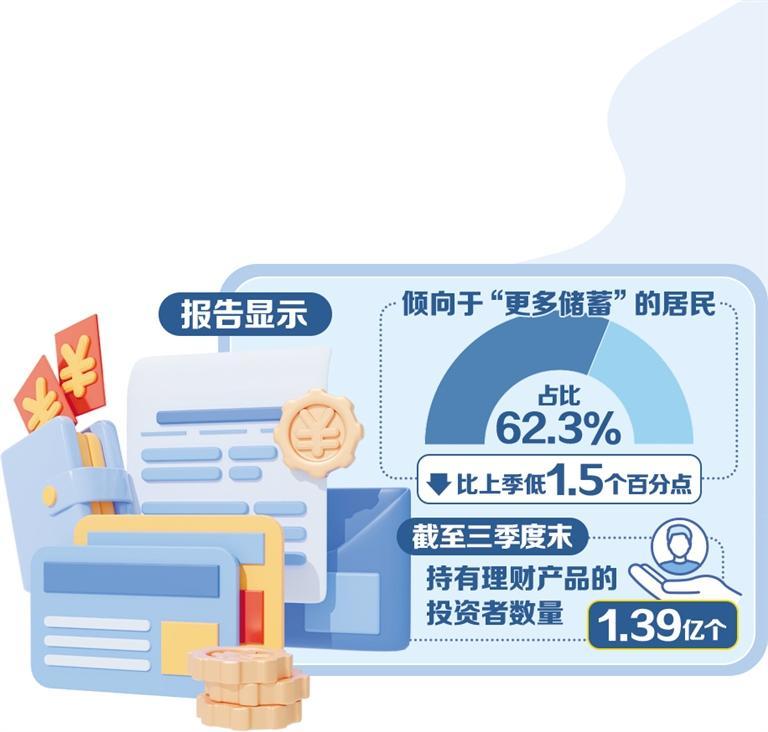 随着存款利率走低,储蓄搬家现象再次上演,银行理财凭借低波动特性越来越受到储户青睐。《2025年第三季度城镇储户问卷调查报告》显示,倾向于“更多储蓄”的居民占62.3%,比上季低1.5个百分点。此外,选择银行非保本理财投资方式的居民占比也较高。《中国银行业理财市场季度报告(2025年三季度)》显示,截至今年三季度末,持有理财产品的投资者数量达1.39亿个,同比增长12.70%。理财投资者数量保持增长态势。