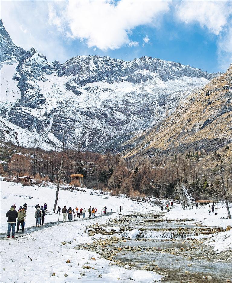 11月29日,四川省阿坝藏族羌族自治州理县,初冬时节的毕棚沟景区雪山巍峨、溪流潺潺,吸引众多游客前来游玩。文 瑞摄(中经视觉)