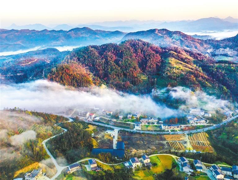 日前,湖北省十堰市竹溪县县河镇马鹿山云海奔腾,将生态宜居的和美山乡描绘成一幅美不胜收的动态“水墨画”。