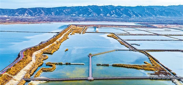 12月2日拍摄的山西省运城市鸭子池湿地。近年来,当地统筹推进七彩盐湖生态修复,通过系统性治理提升水体质量,古老盐湖从生产岸线变为生态廊道。