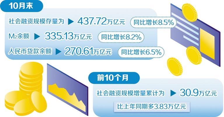 “十五五”规划建议提出,实施更加积极的宏观政策,持续稳增长、稳就业、稳预期。今年以来,适度宽松的货币政策发力显效。金融总量较快增长,10月末社会融资规模存量为437.72万亿元,同比增长8.5%;前10个月社会融资规模增量累计为30.9万亿元,比上年同期多3.83万亿元。与此同时,货币供应量保持较快增长,10月末,M_2余额335.13万亿元,同比增长8.2%。10月末,人民币贷款余额270.61万亿元,同比增长6.5%。