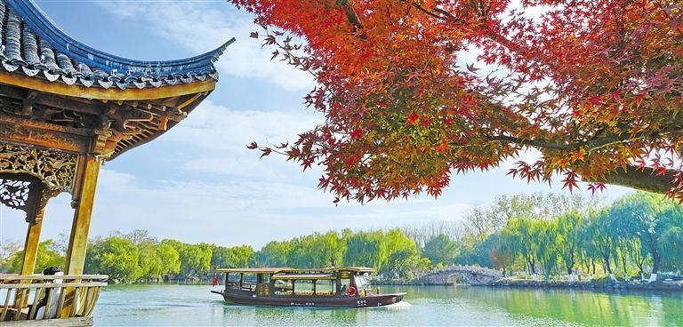 12月4日,浙江省嘉兴市南湖风景区,湖面游船与岸边枫叶相映成景。近年来,当地充分打造绿色生态空间,“开窗见绿、出门见林”已成为许多市民生活的常态。 金 鹏摄 (中经视觉)
