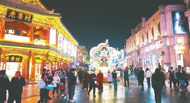 如今的钟楼街,“旧”与“新”和谐共生:白天,老字号坚守传统工艺的同时优化产品与服务,非遗展演等文化活动丰富着消费体验;夜晚,古街被灯光装点得古朴雅致,游人往来不绝,老字号店铺的烟火气与新潮业态的活力相得益彰。日常4万至6万人次、节假日10万至12万人次的日均客流,印证着这条老街的吸引力。