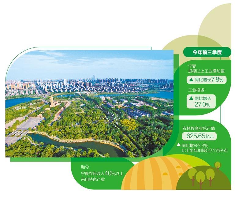 “十四五”以来,宁夏聚焦枸杞、牛奶、滩羊等特色农牧业,以调优结构为目标,以增加农民收入为核心,以“千百十”亿级工程为抓手,以集群发展为路径,大力推动特色农牧业区域化布局、链条化升级、集群化发展。今年前三季度,宁夏农林牧渔业总产值625.65亿元,同比增长5.3%,比上半年加快0.2个百分点。如今,宁夏农民收入40%以上来自特色产业。据宁夏回族自治区农业农村厅副厅长王静戟介绍,宁夏坚持区域品牌、企业品牌、产品品牌“三牌联育”,累计培育特色农业品牌647个、区域公用品牌20个;贺兰山东麓葡萄酒、宁夏枸杞、盐池滩羊的品牌价值位列全国区域品牌百强榜第8位、第10位和第25位,较“十三五”末分别上升1个、5个、8个位次。