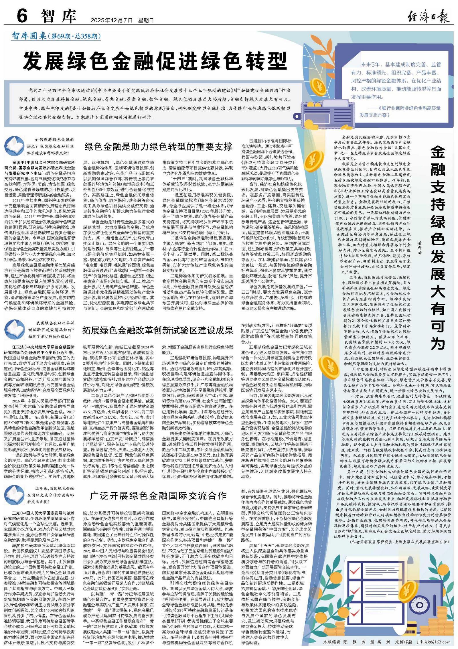 我国是全球首个构建较为完整的绿色金融政策体系的国家,目前已形成以绿色贷款和绿色债券为主、多种绿色金融工具蓬勃发展的多层次绿色金融市场体系。今年初,国家金融监督管理总局、中国人民银行联合发布《银行业保险业绿色金融高质量发展实施方案》,进一步明确了金融支持绿色低碳发展的重点任务。金融是现代经济的核心,在推动经济高质量发展和全面绿色转型中扮演着不可或缺的角色。一是驱动科技创新与产业升级,引导信贷资源从传统高耗能、低附加值产业流向先进制造业、战略性新兴产业和现代服务业,推动产业链向高端延伸。二是促进区域协调与普惠发展,通过设立绿色金融改革创新试验区,借助各类绿色金融工具,加大对重点领域和薄弱环节的金融支持,缩小区域发展差距。三是提升经济韧性与风险管理,运用保险、期货、期权等金融产品,帮助制造业、农业等经营主体对冲价格波动、自然灾害等风险,稳定生产经营。
