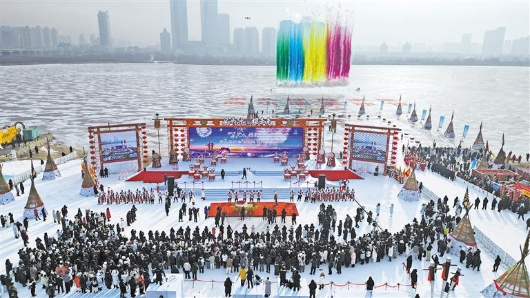 12月7日,第六届哈尔滨采冰节在松花江畔启幕。开幕式上,几十名采冰汉从松花江中采出2025至2026年度冰雪季头冰。头冰将放置在冰雪大世界,向游客发出冰雪邀约。 刘 洋摄 (中经视觉)