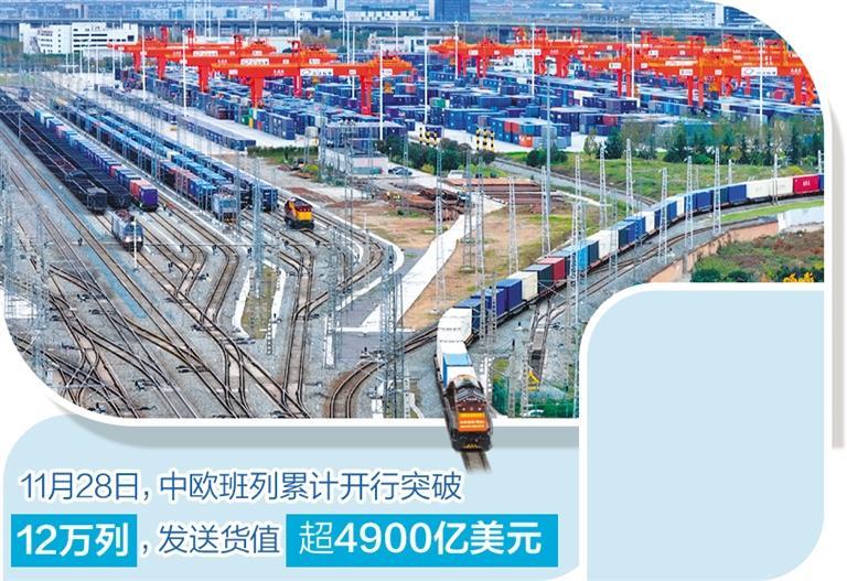 11月28日,随着开往波兰马拉舍维奇的一趟中欧班列从中国成都缓缓发车,中欧班列累计开行突破12万列,发送货值超4900亿美元。作为共建“一带一路”倡议的务实合作载体,中欧班列以其强劲生命力和发展韧性,搭建起沿线经贸合作新平台,有力保障了国际产业链供应链稳定,为世界经济发展注入新动能。