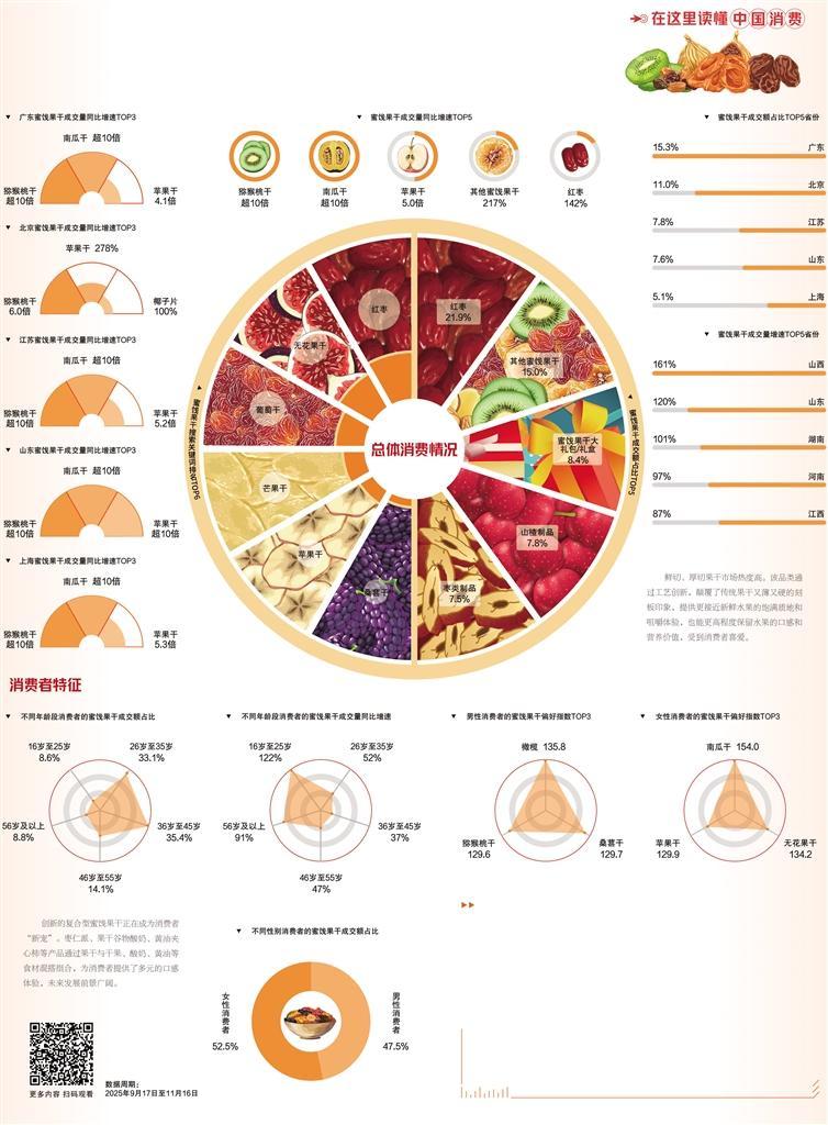 蜜饯果干行业总体规模不断扩大的同时,一些细分品类也呈现出快速增长。近期,猕猴桃干、南瓜干、苹果干等产品在多个省份的成交量实现同比数倍增长。尽管面临供应链效率优化、同质化竞争等挑战,但在消费升级的趋势下,蜜饯果干产业正稳步走向一个更健康、更富情绪价值也更可持续的未来。