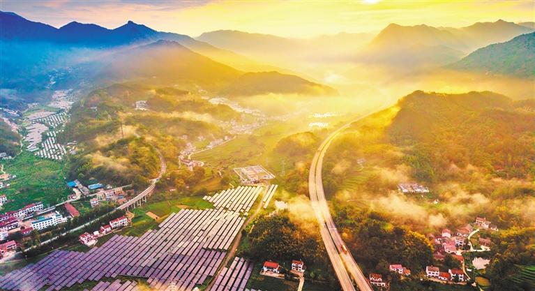 9月14日,湖北省黄冈市英山县杨柳湾镇新铺街村,道路、群山、村庄、光伏发电板相映成景。 王 江摄(中经视觉)