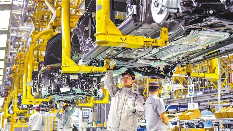 12月9日,位于四川省成都经济技术开发区的一汽—大众成都分公司,员工在组装车辆。该公司最快54秒即可产出下线一辆新车,最高日产量2000台。