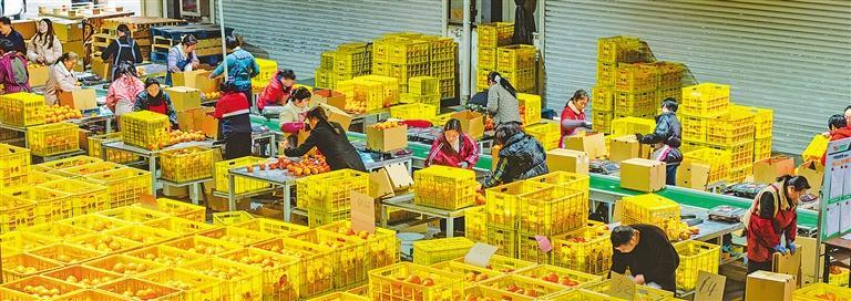 12月12日,湖北省宜昌市秭归县脐橙产业综合物流中心内,工人们正加紧对脐橙进行分拣、打包和转运。