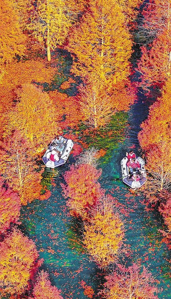 12月14日,浙江省湖州市长兴县龙山街道桃花岕森林公园色彩斑斓,众多市民在公园内观光游玩,尽享冬日美景。