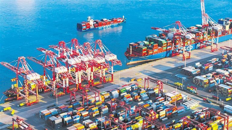 12月14日拍摄的山东港口青岛港前湾集装箱码头。今年以来,青岛港持续织密物流航线网络,新增集装箱航线20条,航线总数扩容至近240条。