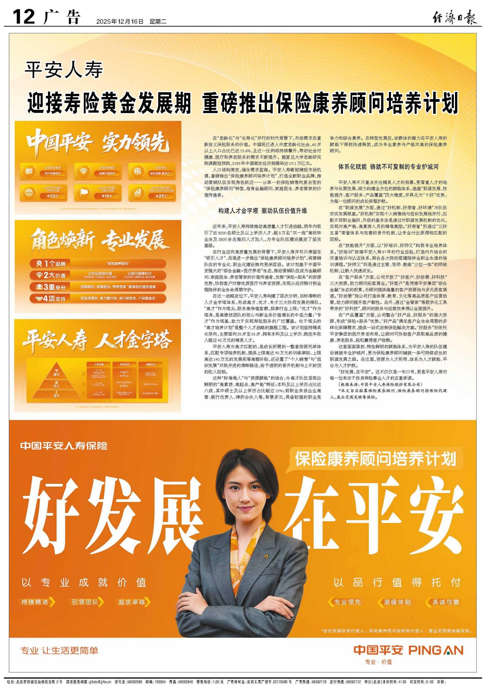 在行业迈向高质量发展的背景下,平安人寿并非只停留在“吸引人才”,而是进一步推出“保险康养顾问培养计划”,将营销队伍的专业化、职业化建设推向更深层级。该计划基于中国平安强大的“综合金融+医疗养老”生态,推动营销队伍成为金融顾问、家庭医生、养老管家的价值传递者,发挥“保险+服务”的资源优势,协助客户对接优质医疗与养老资源,实现从经济赔付到全程陪伴的全生命周期守护。