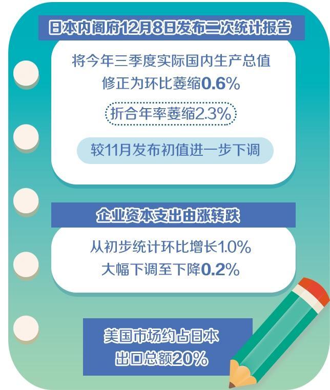 日本内阁府12月8日发布二次统计报告,将今年三季度实际国内生产总值(GDP)修正为环比萎缩0.6%,折合年率萎缩2.3%。这一数值较11月发布的初值进一步下调,且幅度超出预期,证实了日本经济6个季度以来首次萎缩,也凸显日本经济正在承压。