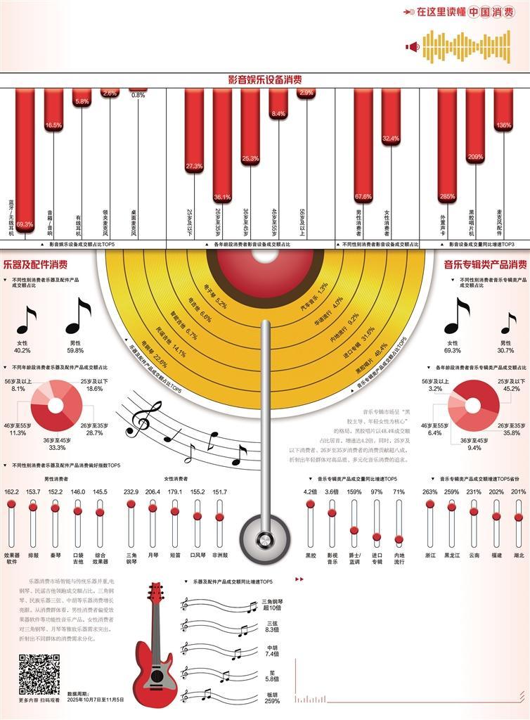 带有文化情怀的消费升温。一股“复古风”和“国潮风”正在声音市场兴起,成为人们连接传统文化、表达自我审美的方式。黑胶唱片机及唱片的销量均实现了数倍增长,实体唱片的质感与收藏价值受到消费者特别是年轻群体追捧。此外,三弦、中胡、笙等传统民族乐器的成交额也成倍增长,购买者以“90后”消费者为主。学习演奏传统民族乐器,成为集艺术审美、连接传统、性情陶冶、社交互动于一体的新潮活动。