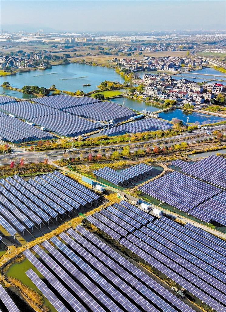 十二月十五日拍摄的浙江省湖州市长兴县洪桥镇古龙村渔光互补光伏发电站。近年来,当地利用河塘水库、废弃矿场、荒坡沙砾地,建设水上、地面光伏发电设施,实现经济和生态效益双收。陈海伟摄(中经视觉)