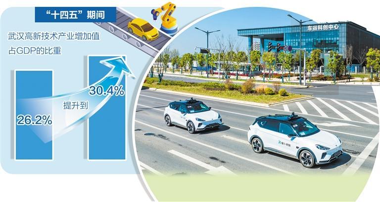 依托“五谷”,“十四五”期间,武汉高新技术产业增加值占GDP的比重从26.2%提升到30.4%,数字经济核心产业增加值占GDP的比重从8.9%提升到14.6%。全市高新技术企业数量从8000多家增长到16000多家,每万家企业中高新技术企业数量达171家。